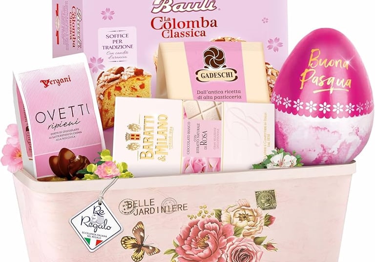 Pacco regalo per gli auguri pasquali con i prodotti tipici della festa